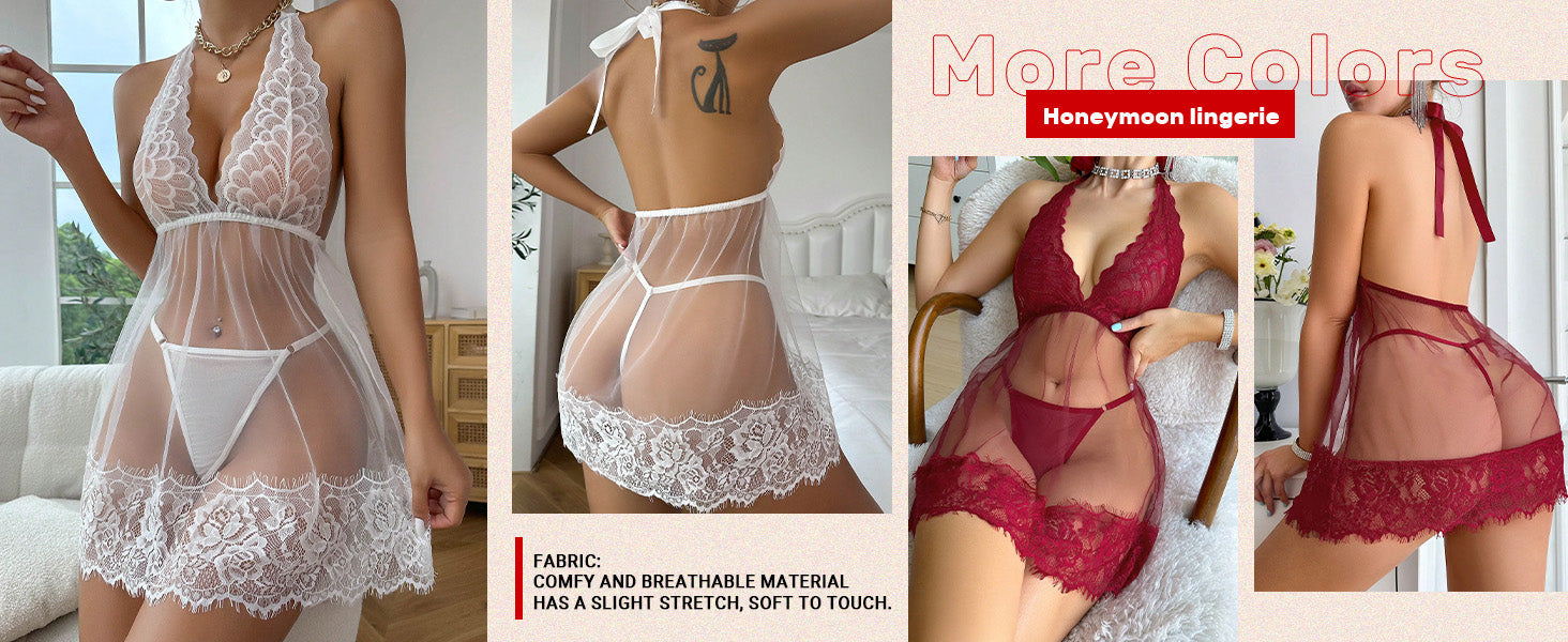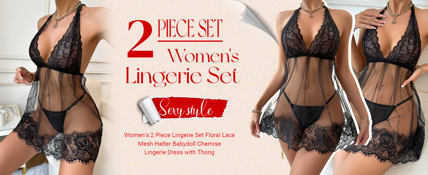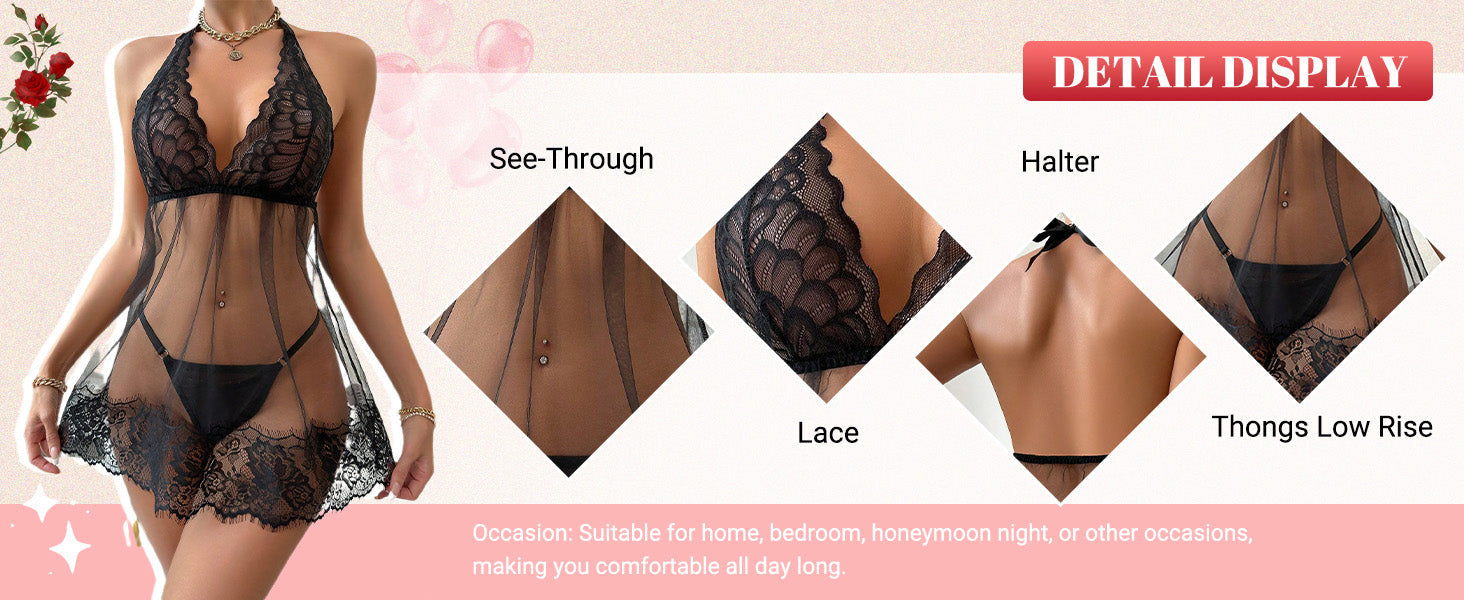 Floral Lace Halter Babydoll Lingerie Dress With Thong